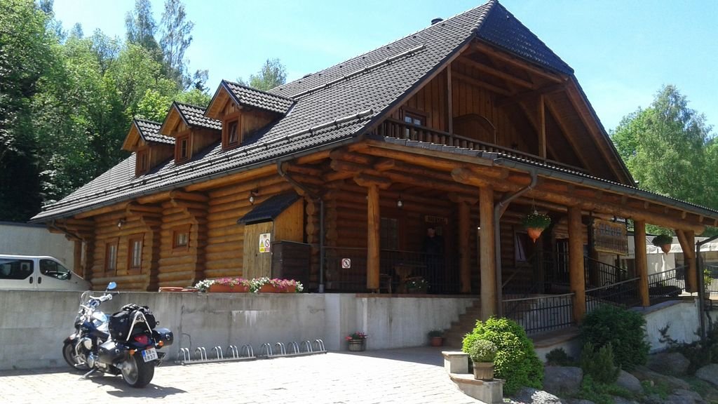 Konec dobrý, všechno dobré – cílová zastávka druhého dne, ubytování v Pivovaru Henrdych ve Vrchlabí. Výborné pivo, omezená kuchyně, kvalitní ubytování a úschovna motorek doslova ve výloze…..